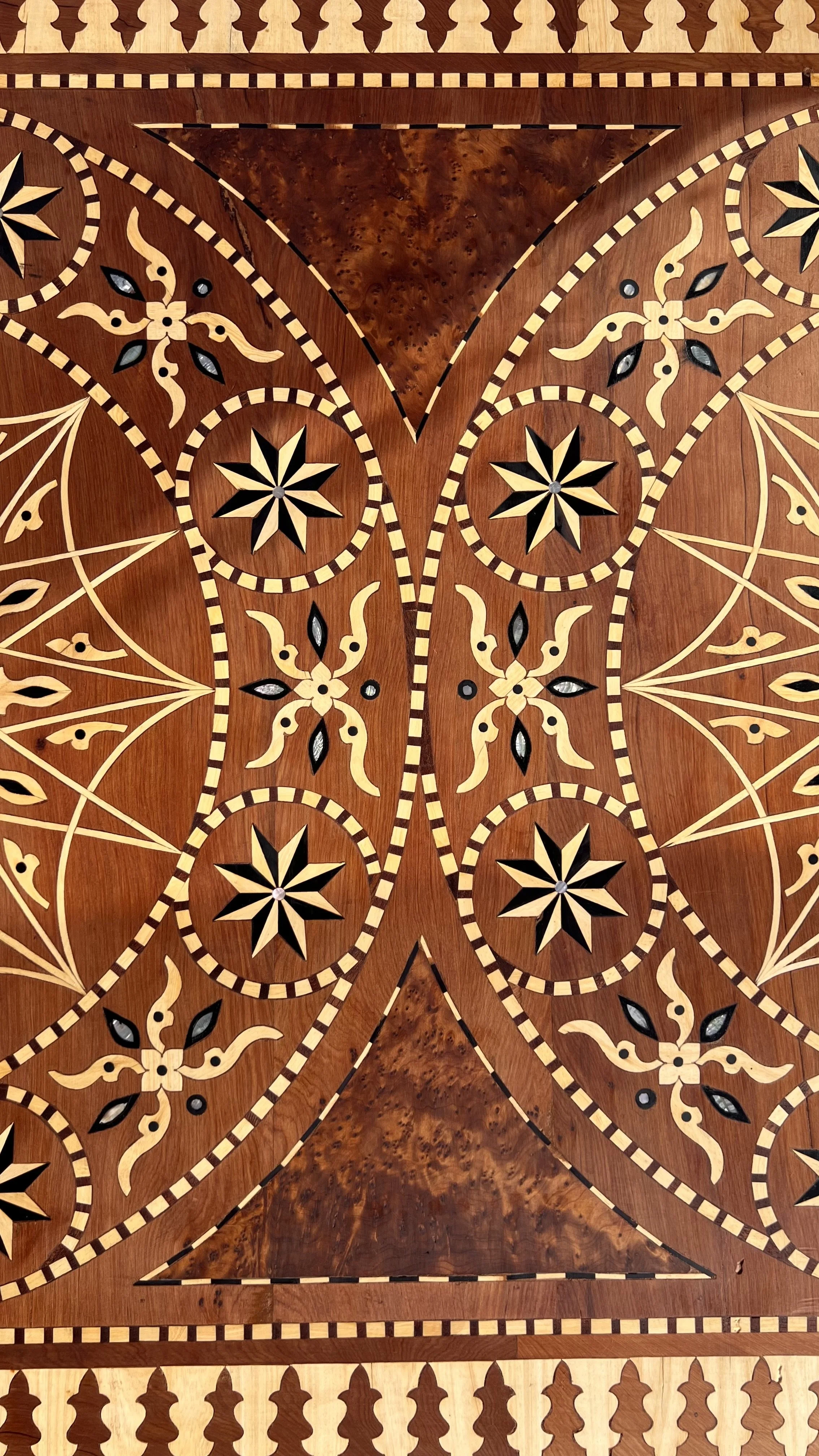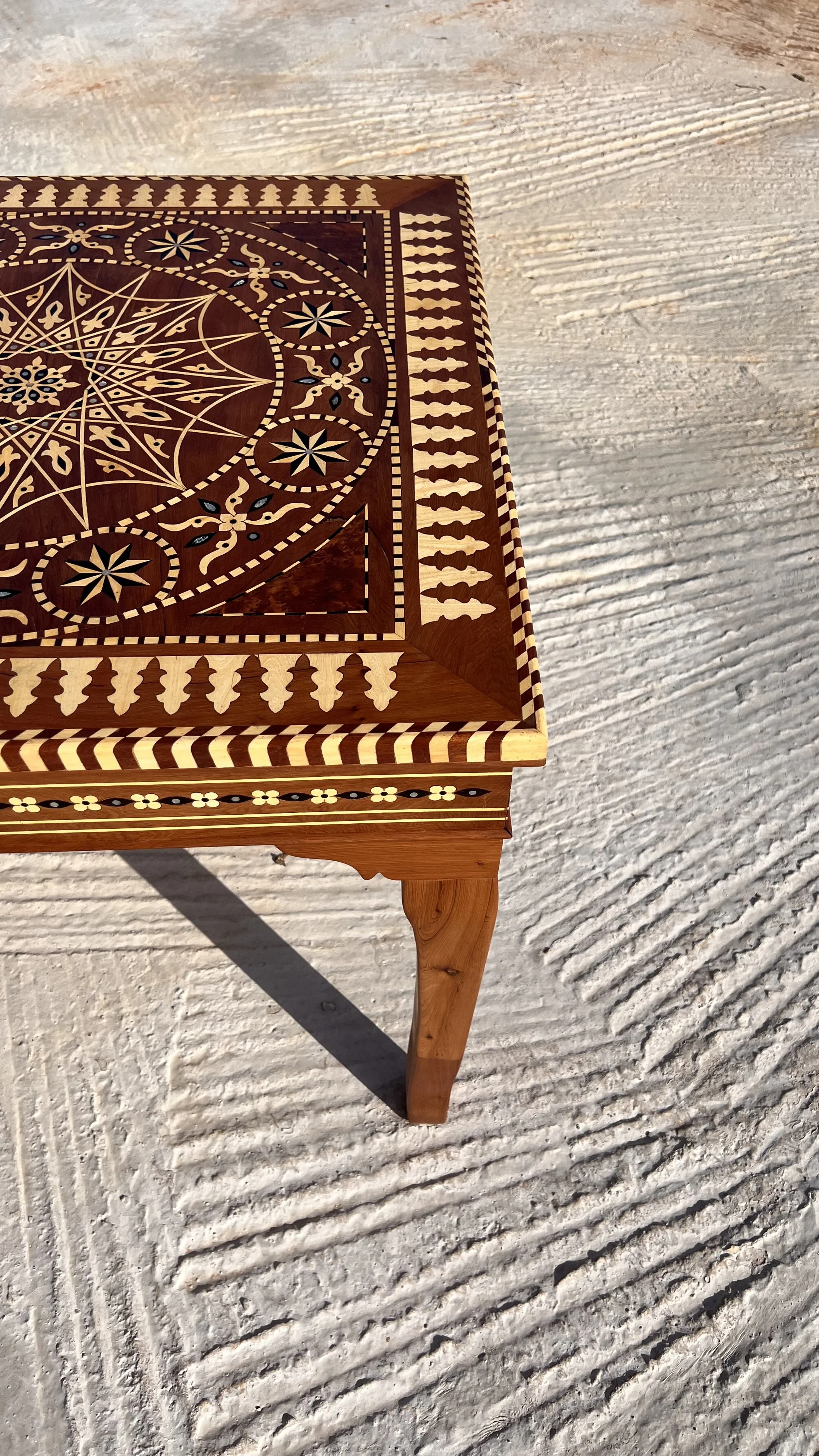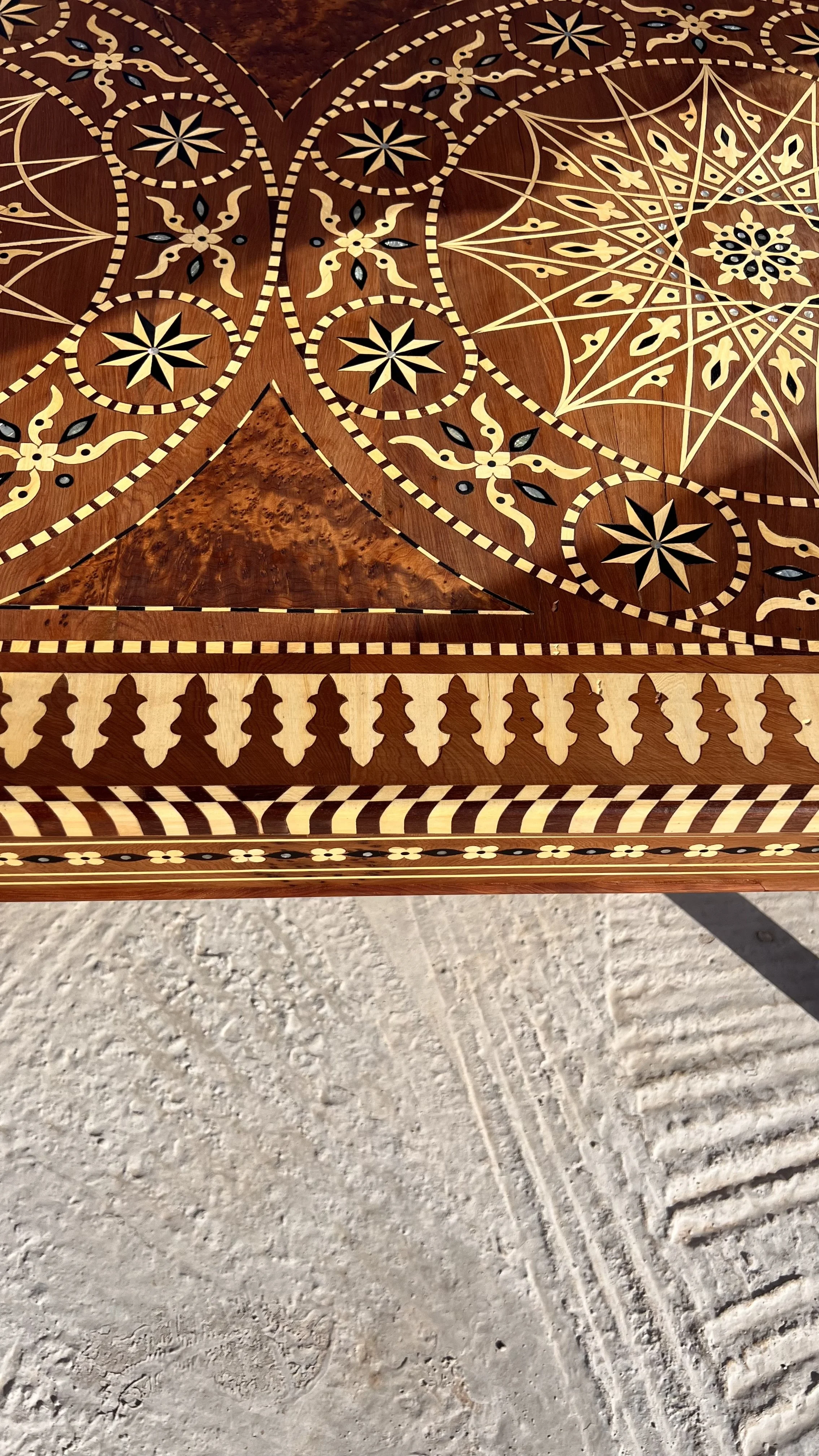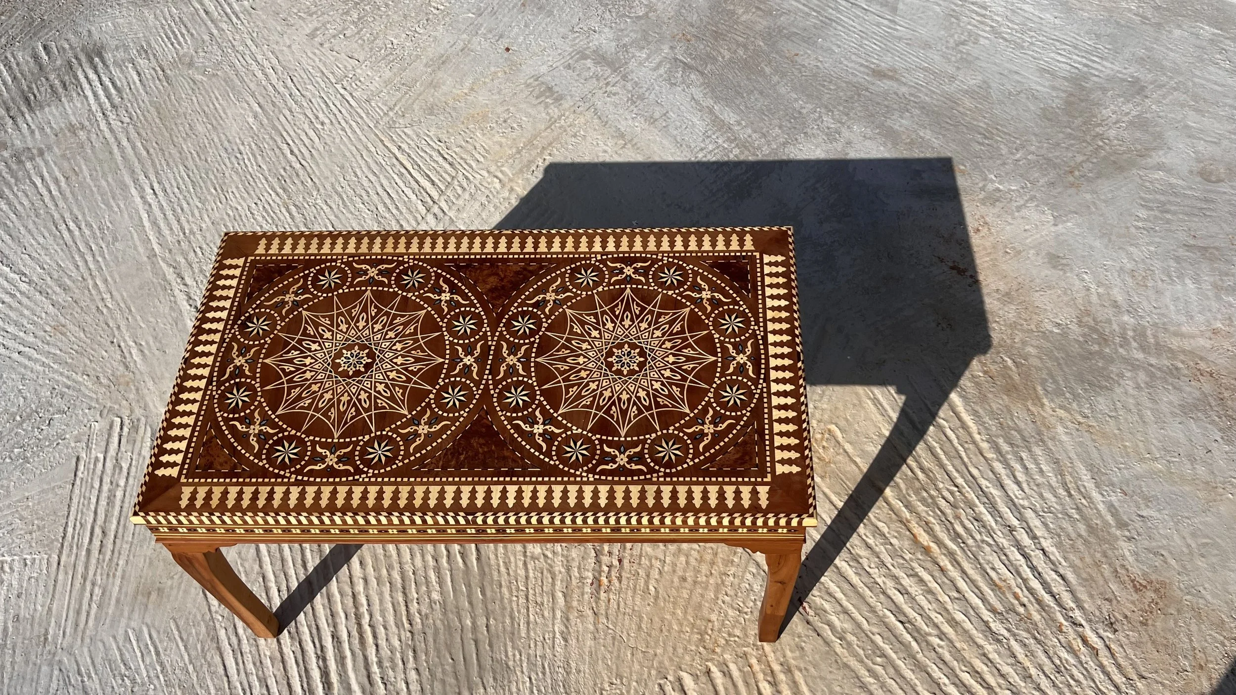 This striking dining table features a meticulously crafted 16-fold rosette inlaid with lemon wood, creating a harmonious and symmetrical design that draws the eye. The rich, warm tones of the lemon wood bring depth and character to the table, making it the perfect centerpiece for any dining room. A blend of elegance and craftsmanship for memorable gatherings.